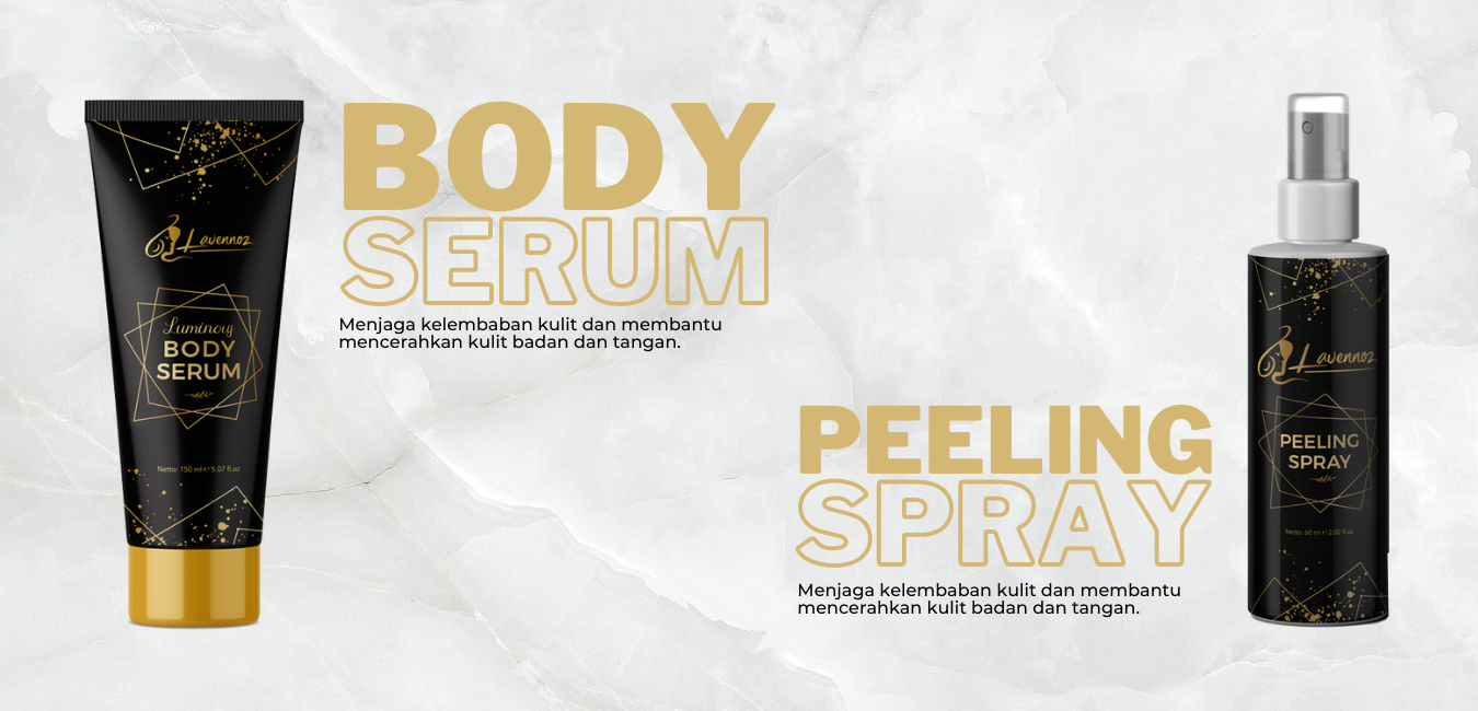 Serum pemutih badan untuk membantu mencerahkan kulit dan sebagai UV filter. Lavennoz Body Serum dan Lavennoz Peeling Spray akan membantu menjaga kulit dari paparan sengatan sinar matahari agar kulit tidak rusak dan gelap.
